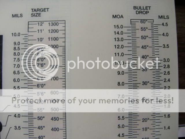 il mio target 32 pollici sottende a 2.5 MILS ...... vado a leggere in corrispondenza della freccia del target range e trovo circa 325 metri ...trovo questo valore facendo scorrere la parte interna del regolo in un senso o nell'altro... per cui tiro verso il basso la slide interna e faccio coincidere 32 con 2.5 MILS (dico 32 pollici perchè so che ho posizionato una sagoma di carta che misura in altezza circa 32 pollici o 81cm.....). Ottengo il valore in MILS perchè semplicemente sovrappongo il mio reticolo al bersaglio e vedo che i MILS dell'ottica occupano uno spazio di 2.5 MILS sul bersaglio per tutta la sua altezza. Utilizzo misure facili ma vi renderete conto da soli che non sempre i valori possono combaciare, per cui spesso dobbiamo interpretare, non sempre leggo un numero intero, può essere 2.5 oppure leggermente di più.