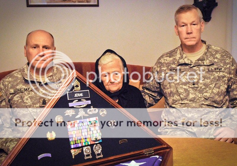 Credo , anzi ne sono quasi sicuro :D , che la foto in questione si riferisca a Ivica Jerak , Master Sergeant dell'esercito ucciso nel 2005.Non per niente ci sono 2 membri dell'esercito (per altro un CSM e un Major General) di fianco alla signora , che mi sembra molto "donna dell'est".Infatti Jerak era nato in Jugoslavia.Come intuite da badge e crest (e anche dai gradi dei due signori in foto) , faceva parte della Delta Force , o come si chiamava nel 2005. :)