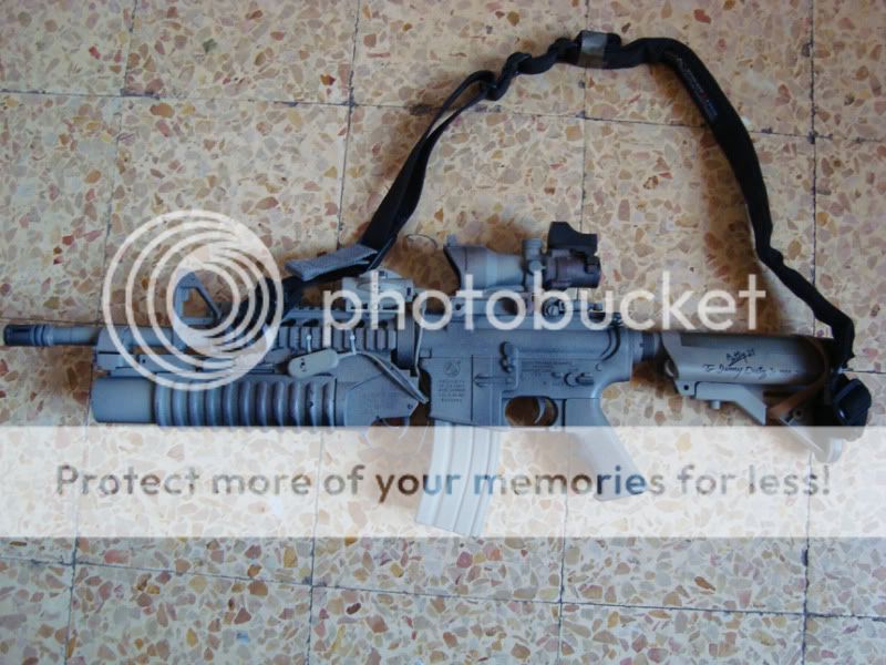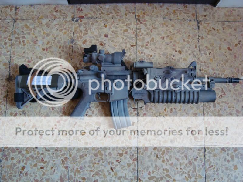 Non so se è possibile farlo ma vorrei condividere con voi le foto del mio G&P M4A1 M203 con una piccola modifica , cioè il calcio Bushmaster è stato sostituito con un Crane per il resto ho aggiunto: Flipup anteriore, una ACOG 4X32 Element + Minidot, una AN/PEQ-2 porta batterie della DBOYS che non lo uso per le batterie ma l'ho modificato per ospitare una torcia tipo surefire all'interno e un laser IR (ancora in fase di costruzione) e infine un CVL sul front top RIS.