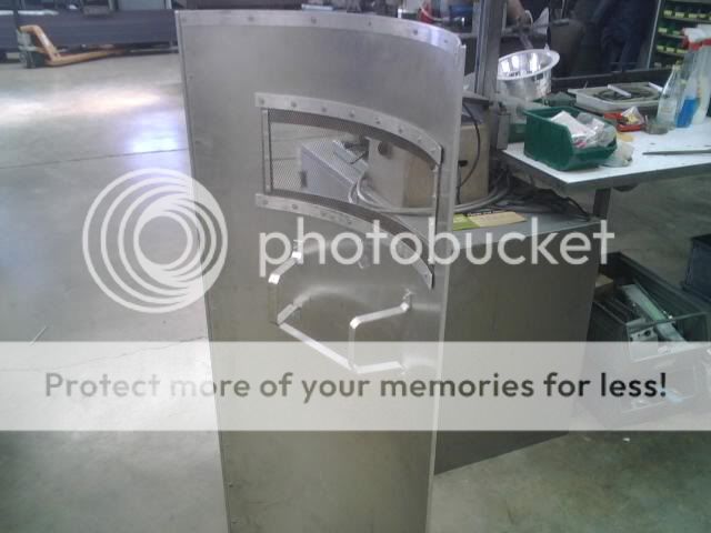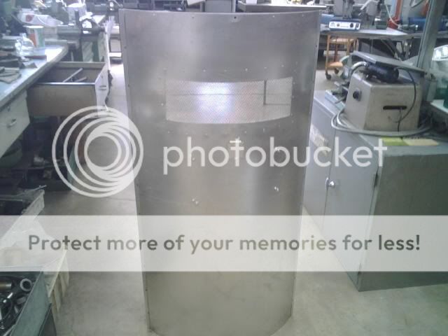 prendete la lamiera e le date una leggera curvatura ,utilizando la calandra (andate da un fabbro),una volta fatto cio' , utilizzando il seghetto alternativo praticate il taglio per la finestrella , a questo punto dovete piegare il tondino del 10 (io l'ho piegato a mano con l'aiuto di un martello e di una morsa) una volta che lo avrete modellato in modo da avere un semicerchio controllate che il vostro braccio passi al suo interno abbondanteme e poi lo saldate alla lamiera .