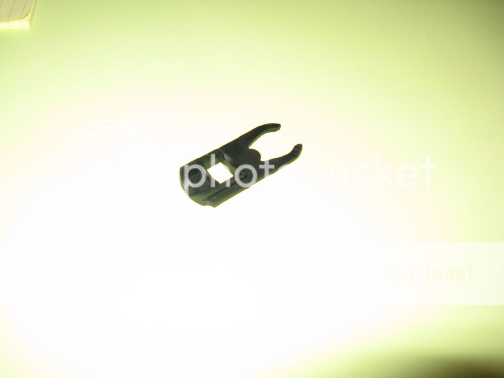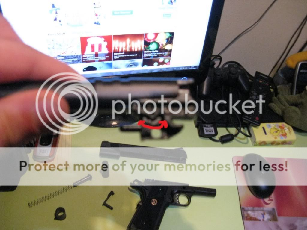 sfilando il perno indicato dalla freccia si tira via il blocchetto con l'anello per il mollone di sicurezza e viene fuori una molla. basta inserire un bb all'interno del canale, poi reinserire la molla, rimontare la spina e usare la pistola.
