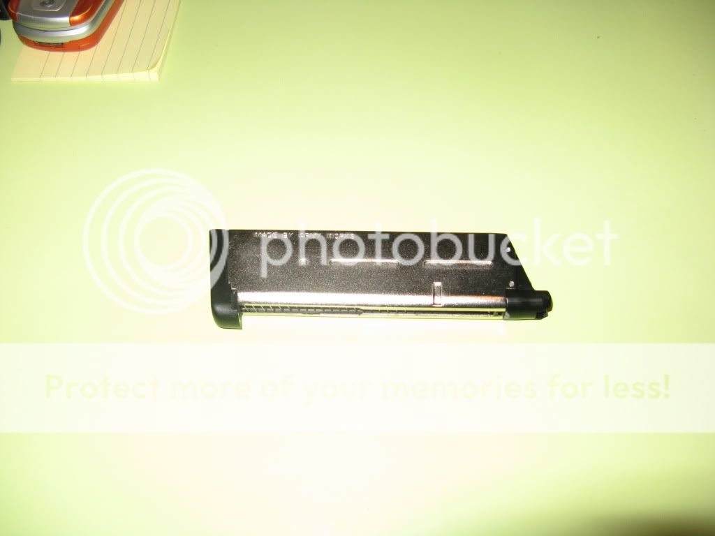 caricatore in metallo. marchiato "made by army works", è molto ben fatto, non perde gas ed è compatibile con quelli della bell e kjw. il pad sul fondello è in plastica, o gomma molto dura (a me sembra plastica, ma francamente me ne importa anche poco). tiene 26 colpi e con una carica di gas vengono sparati tutti.