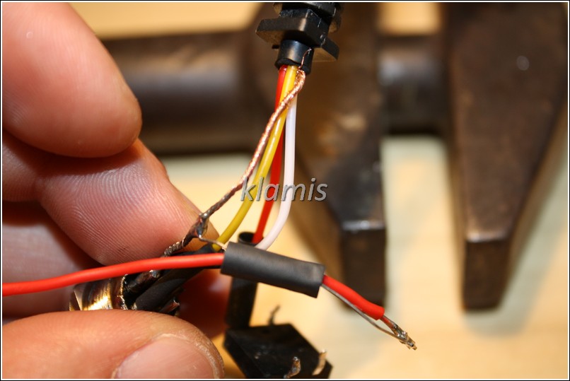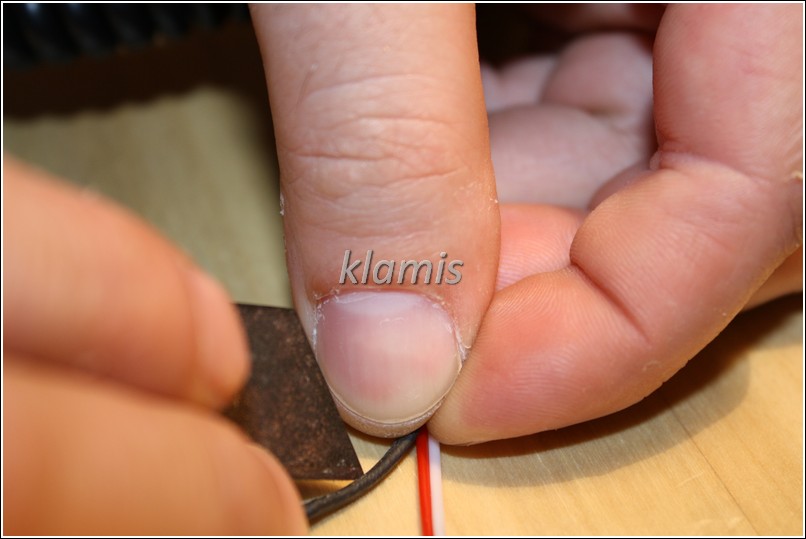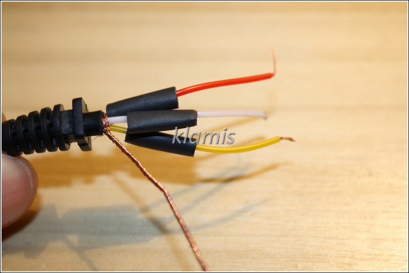 - togliete il termorestringente di colore nero da tutti i cavi con l'ausilio di un trincetto(foto7) meno che quello completamente ricoperto, lo faremo dopo, ottenendo questo risultato (foto8).