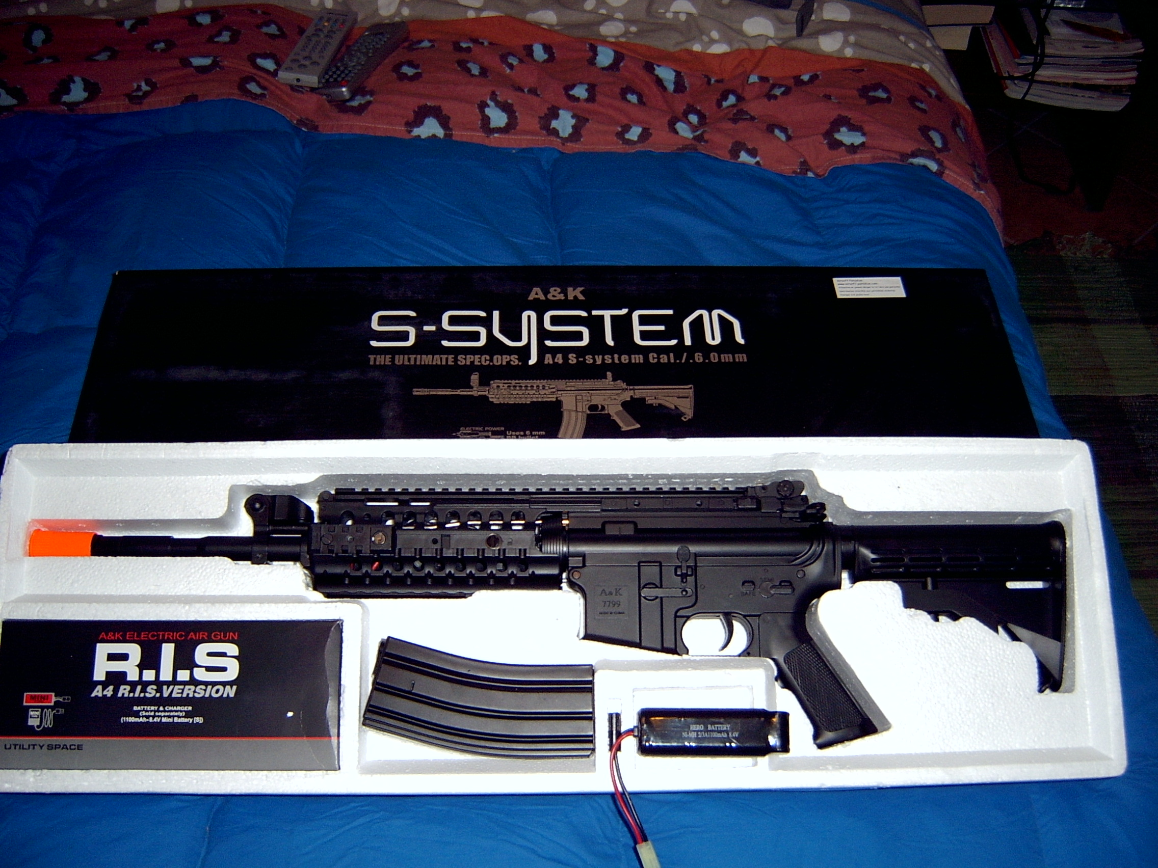 nella scatola troviamo il fucile (per fortuna), caricatore da 300 colpi, caricabatteria 8,4 300mah con connettore cinese ma che funziona anche nelle nostre prese, batteria anonima 8,4 1100mah, impugnatura verticale per il ris, un cacciavite, accessorio per regolare il mirino anteriore, un sacchetto di pallini (ci ho riempito il caricatore)