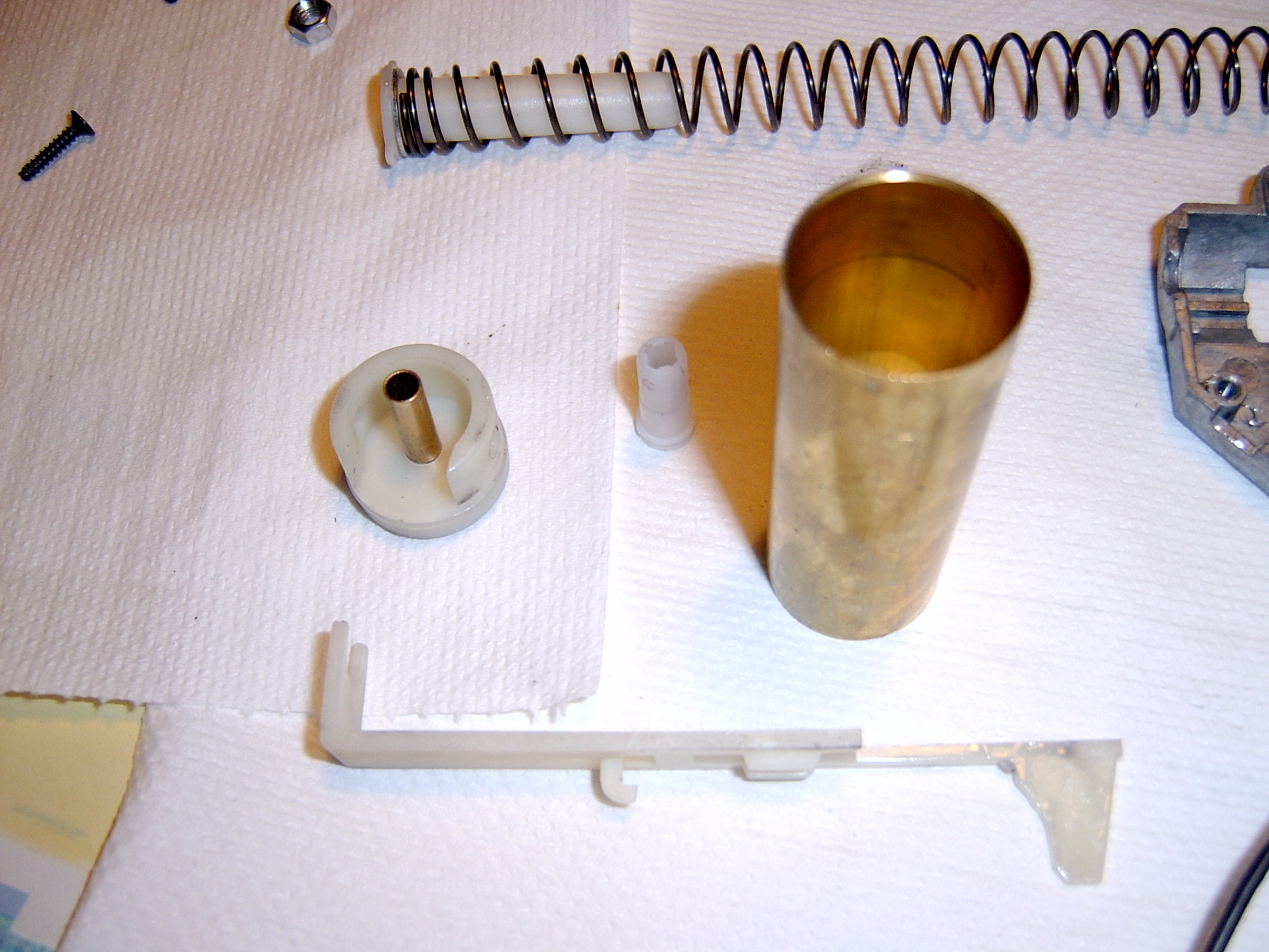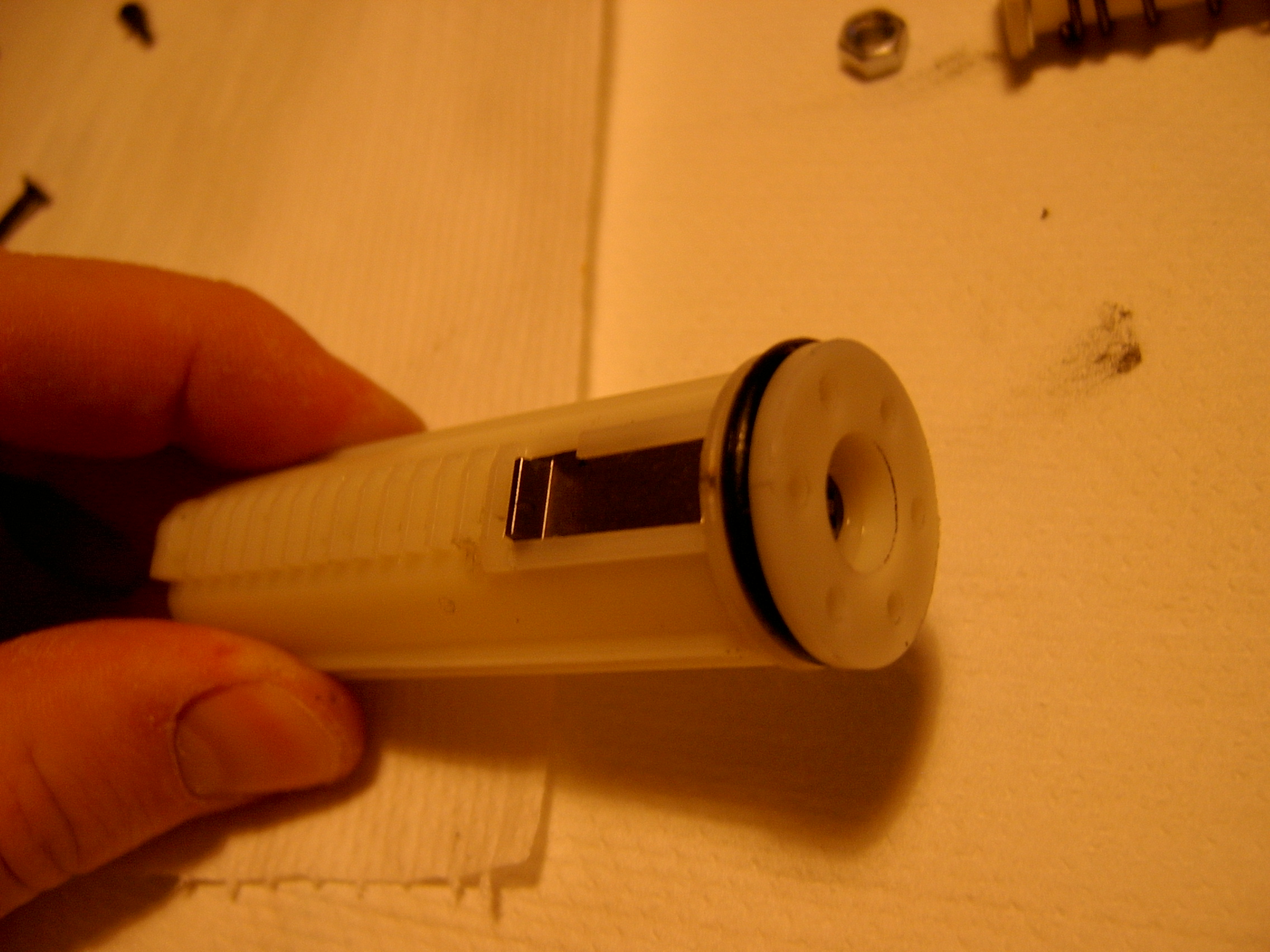 il gruppo aria è la parte più critica di questa arma, il pistone è di una plastica bianca quasi trasparente, comparato con un marui originale sembra più fragile e meno curato, la testa è antivuoto con 4 fori avvitata sul pistone.