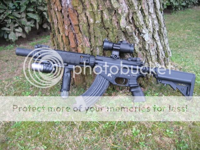 Adoro lo stubby, piccolo mostro, spara bene ed è sicuramnete l'asg di backup più azzeccata. Questo esemplare è stato assemblato totalmente, gusci G&P del vecchio kit dell'MK18, meccanica con motore eg1000, ingranaggi originali, molla etabeta, pistone maruie T HU systema. E' stato modificato anche il calcio G&P per avere il comodo sportellino per il vano batterie. Sistema di puntamento red dot G&P.