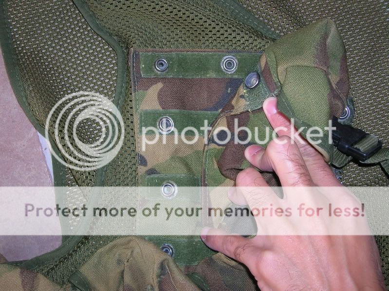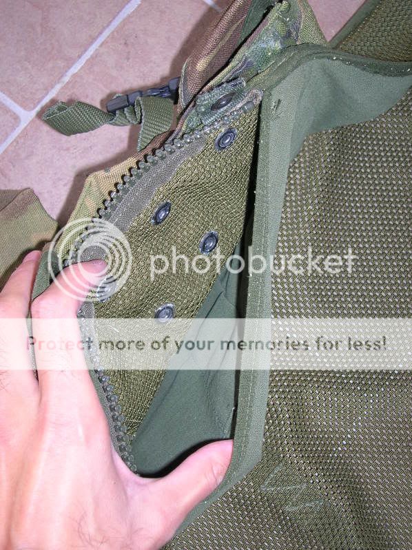 Anzitutto il particolare sistema di fissaggio delle tasche sup. che, combinando velcro e bottoni a scatto, permette una seppur minima "modularità", seppur ridotta alla possibilità di attaccare o meno le tasche. Il vest dovrebbe in origine esser fornito di tre tasche removibili (due grandi e una piccola, io ho purtroppo solo le due in foto).