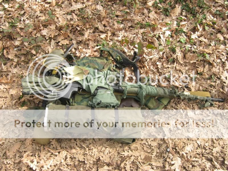 Sullo spallaccio sinistro (quello della mano debole contro cui non deve poggiare il calcio del fucile) ho messo l'IPP della Sposn e un coltello da sopravvivenza con cui eventualmente tagliare rami, foglie costruirmi ripari etc. Sulal cintura ho messo una fondina per Makarov in cui ho portato la sig P232, cmq l'idea era quella di avere anche una pistola, eho portato anche la borraccia. Nel porta caricatori dell'RD ho messo un car per AK74 e la radio. Nelle tasche porta granate portavo la macchinetta fotografica e il binocolo.