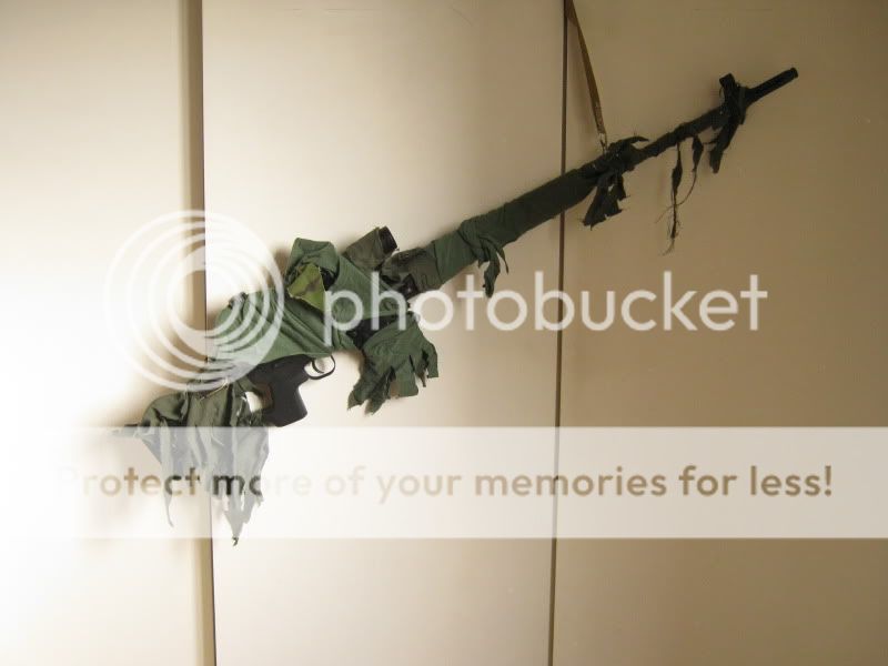 Ho camuffato l'SVD in maniera tale da non renderlo immediatamente riconoscibile come fucile e credo che abbia funzionato. Per farlo ho utilizzato dei vecchi residui di una maglietta dell'esercito francese e di una camicia moleschin tedesca oltre ad uan strisciolina in DPM. Ho legato alcune cose con lo spago e ho cercato di rendere il tutto frondoso per spezzare la figura dell'arma.
