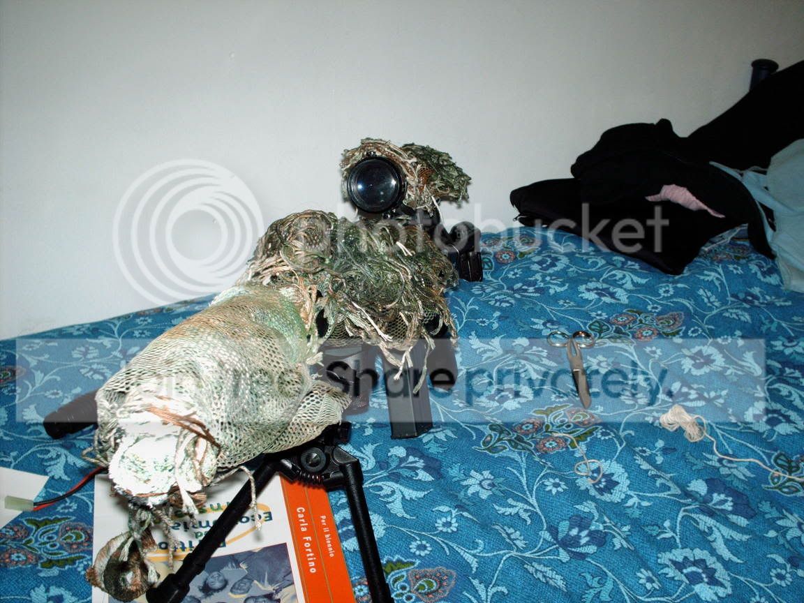 eccolo, le foto le ho fatte in condizioni non molto adatte, infatti non rende come dovrebbe il mimetismo (la fretta), il mimetismo del silenziatore è stato rimosso e nella foto ho cercato di reinserire quest'ultimo nel "kit" ma niente ne è entrato solo una parte e per di più è visibile solo la parte senza fili per la mimetizzazione